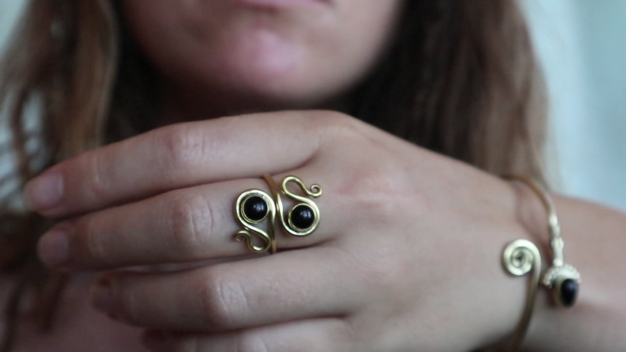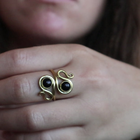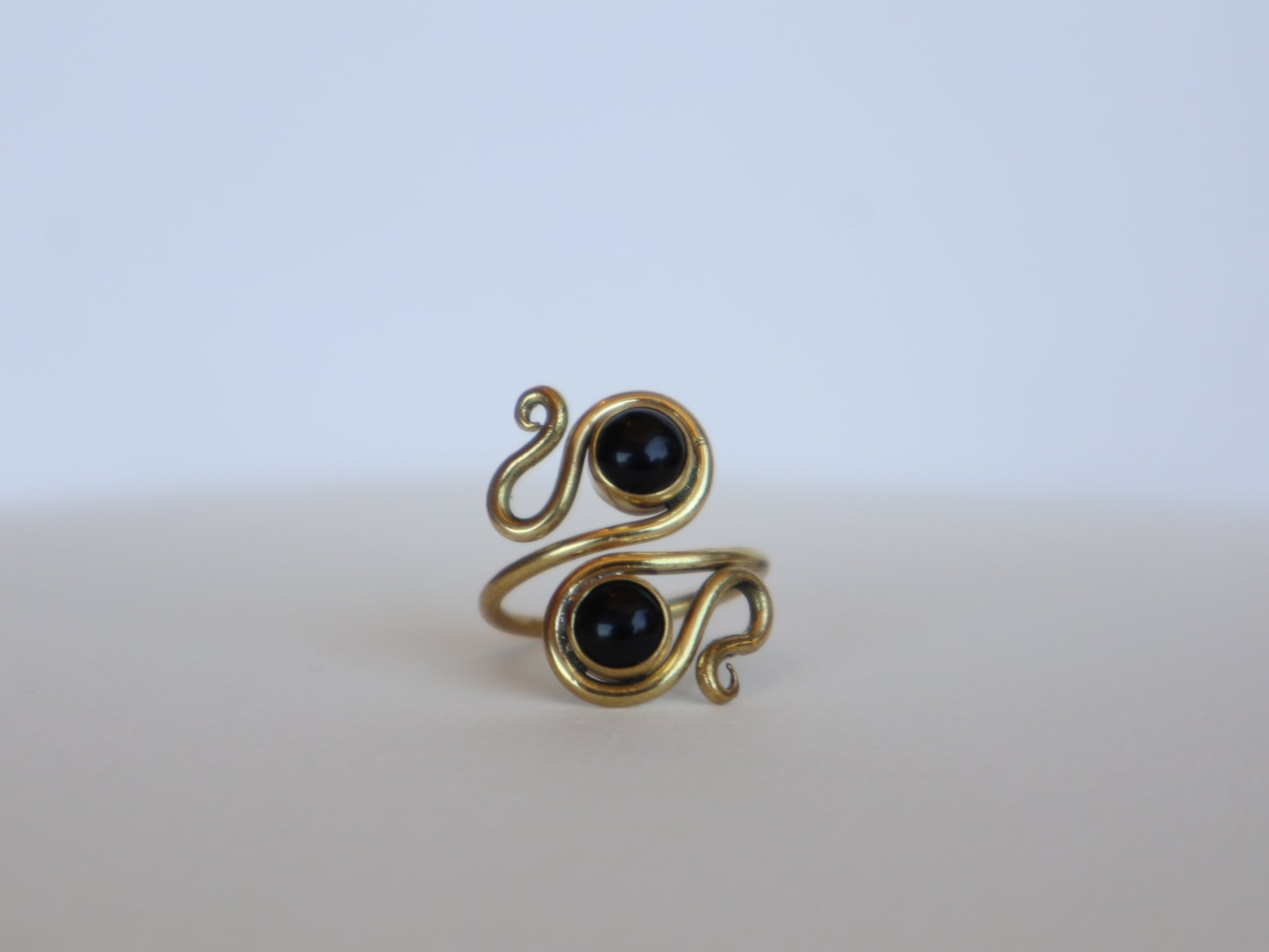 Wunderschönes handgefertigtes verstellbares Unisex-Messingarmband und verstellbarer Unisex-Messingring mit magischen Obsidiankristallen