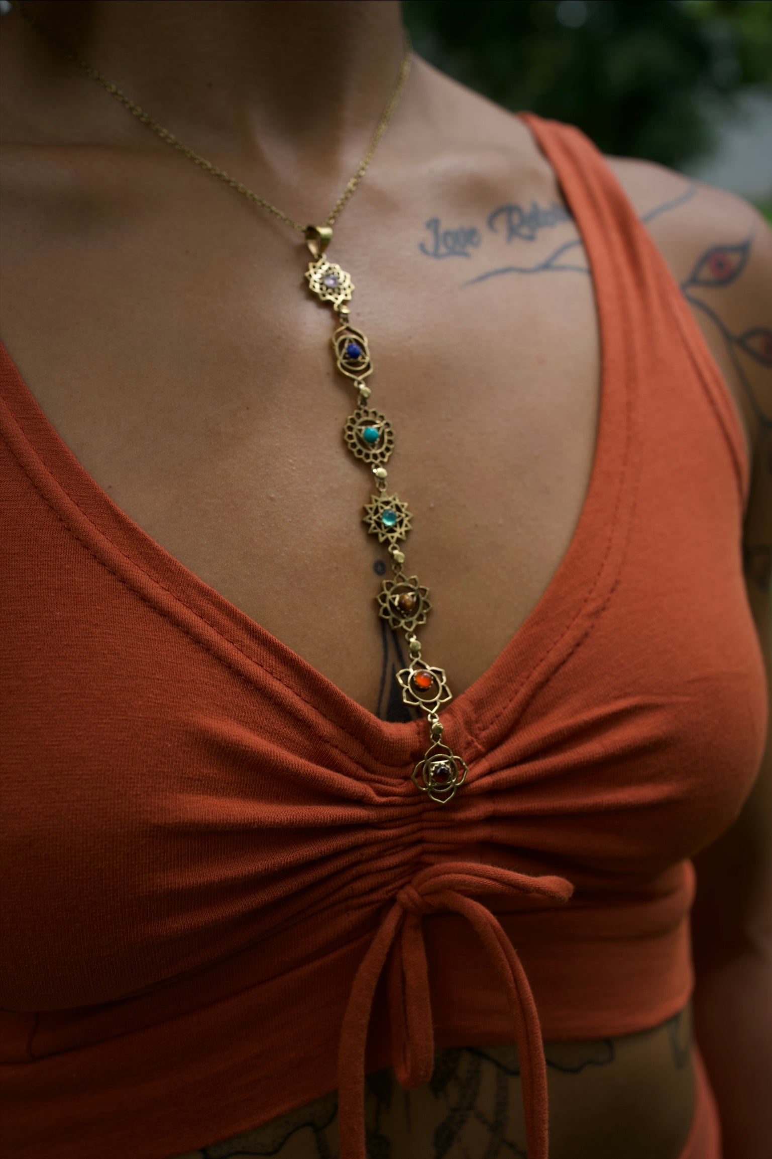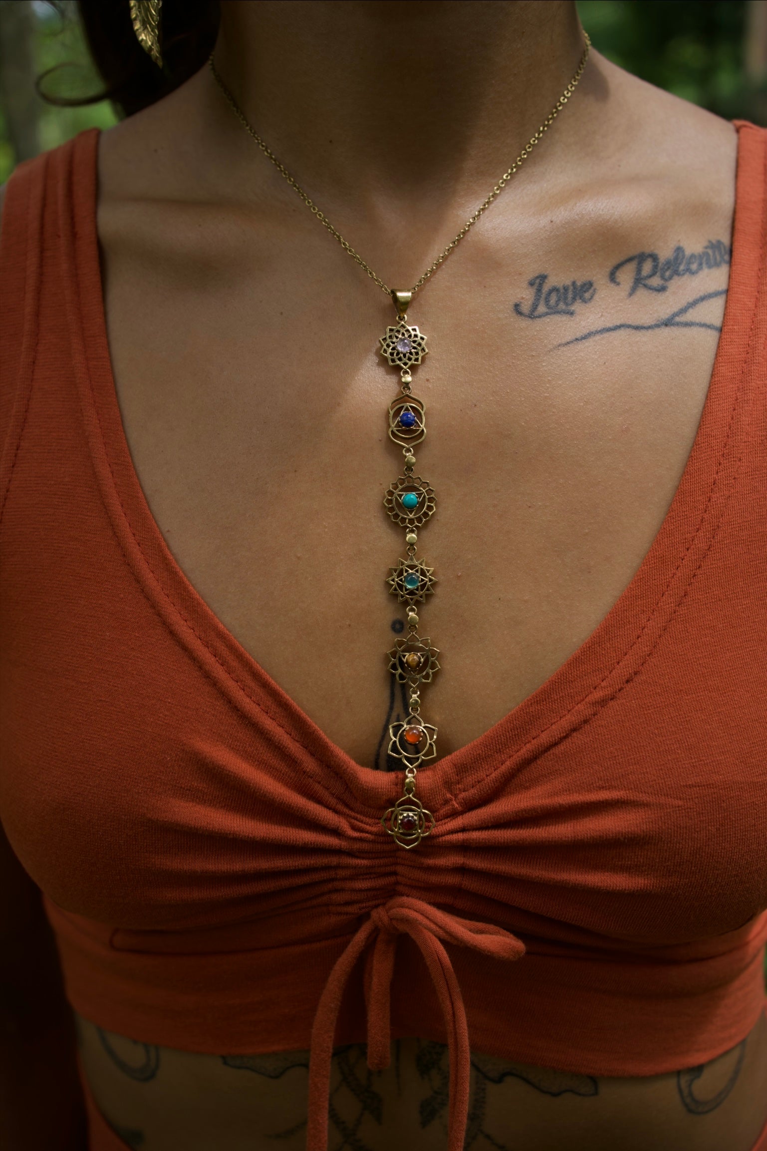 Beautiful handmade adjustable unisex brass pendant with 17’ brass chain and magical sacred geometry protective ornaments and seven natural crystals balancing chakra energy centers