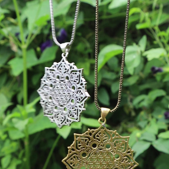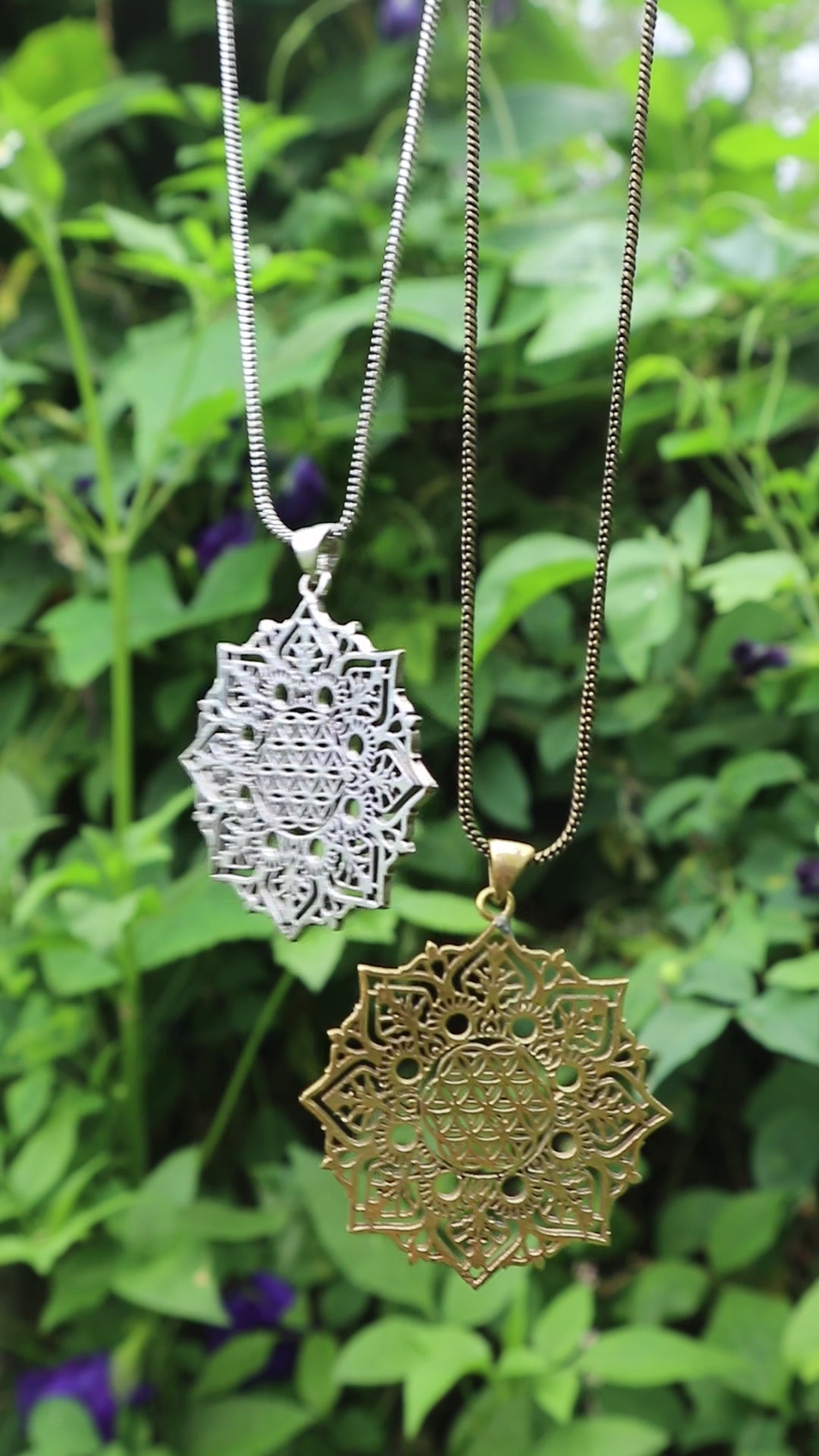 This radiant pendant embodies the Flower of Life, one of the most ancient and sacred symbols known to humanity. Its interlocking circles form a pattern of perfect harmony and divine creation, said to hold the blueprint of the universe itself.