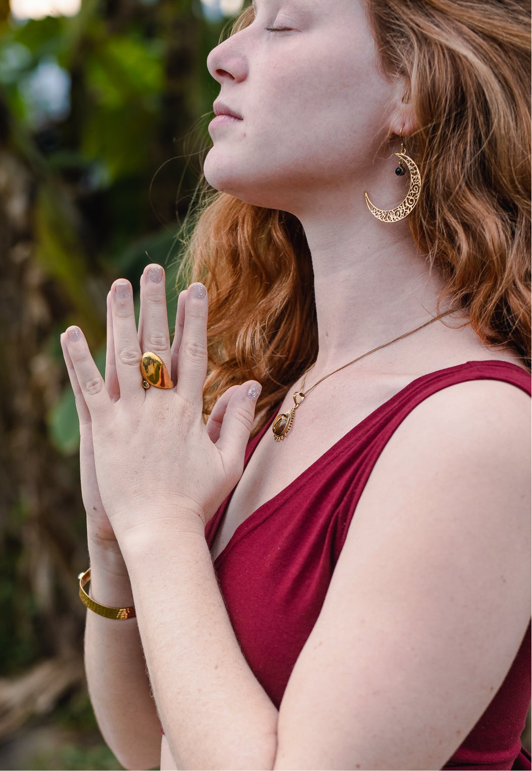 Hand-crafted from polished brass, the Energy Shield Ring is more than an accessory — it’s a guardian. Its bold yet minimal form channels grounding energy, creating a subtle field of strength around you.