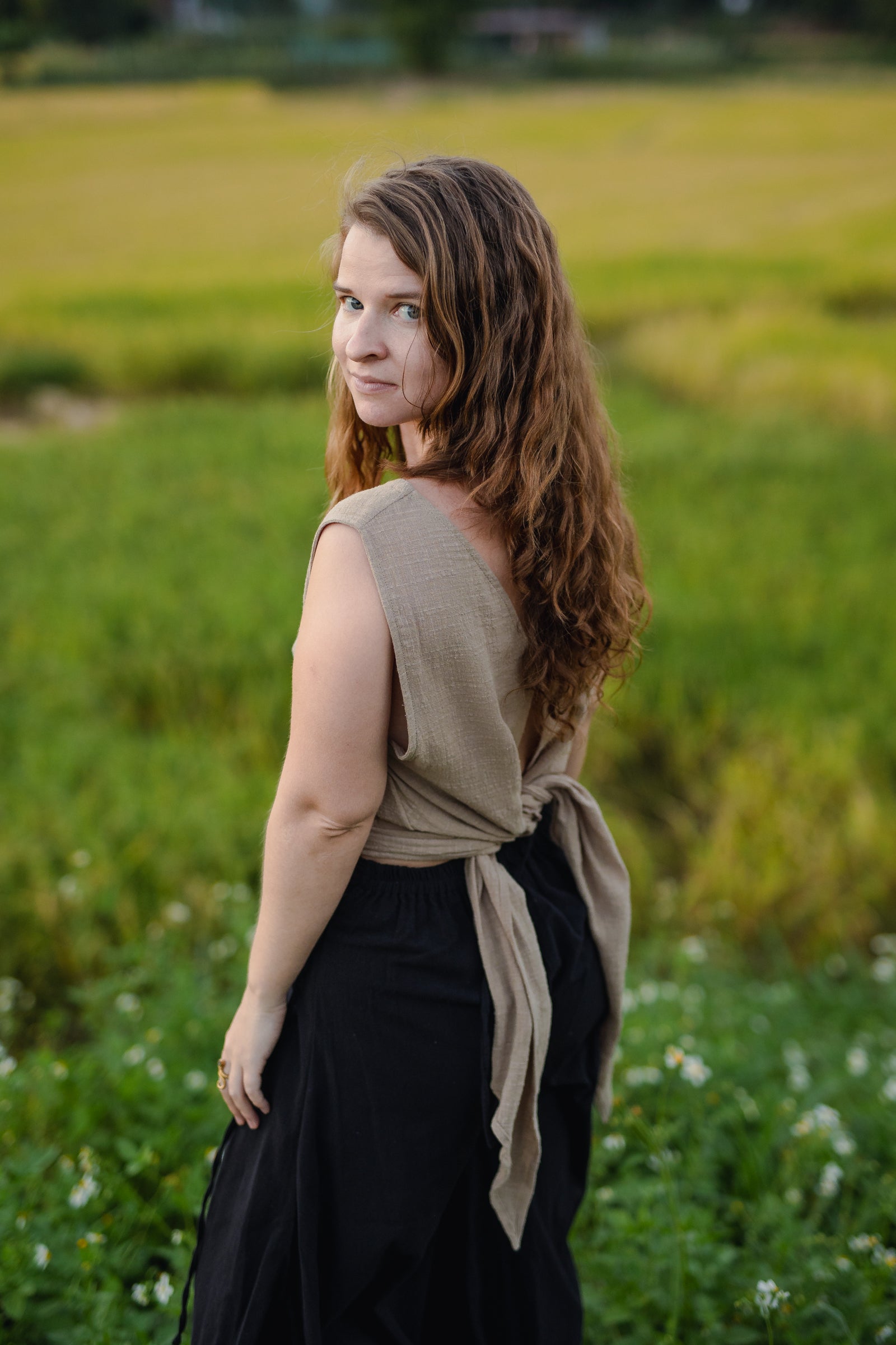 Embrace natural elegance with the Eva Top, crafted from a soft, breathable blend of organic bamboo and cotton grown in Thailand. This earthy, reversible design features a flowing asymmetrical cut and an open-back silhouette that can also be worn as a stylish V-neck front – giving you two looks in one.