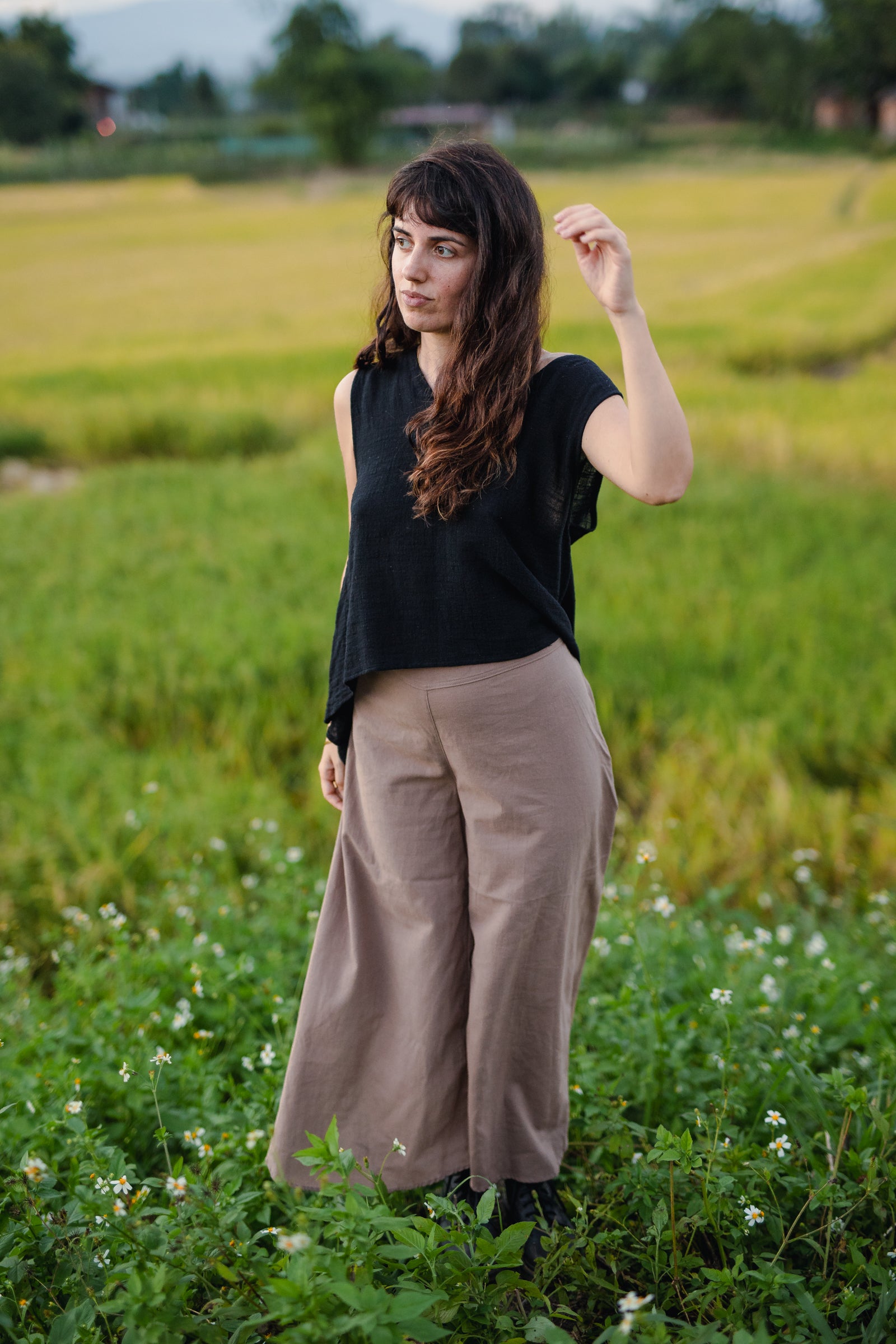 Lightweight and gentle on the skin, the Eva Top is perfect for warm days, conscious living, and soulful adventures. Whether you pair it with wide-leg pants or layer it for a boho-chic look, this piece effortlessly combines comfort, sustainability, and versatility.