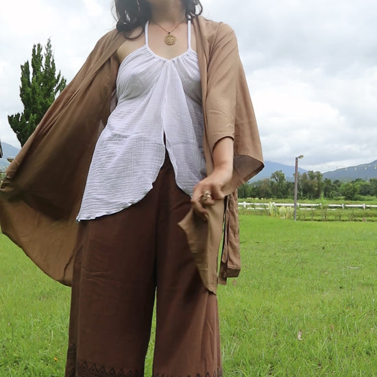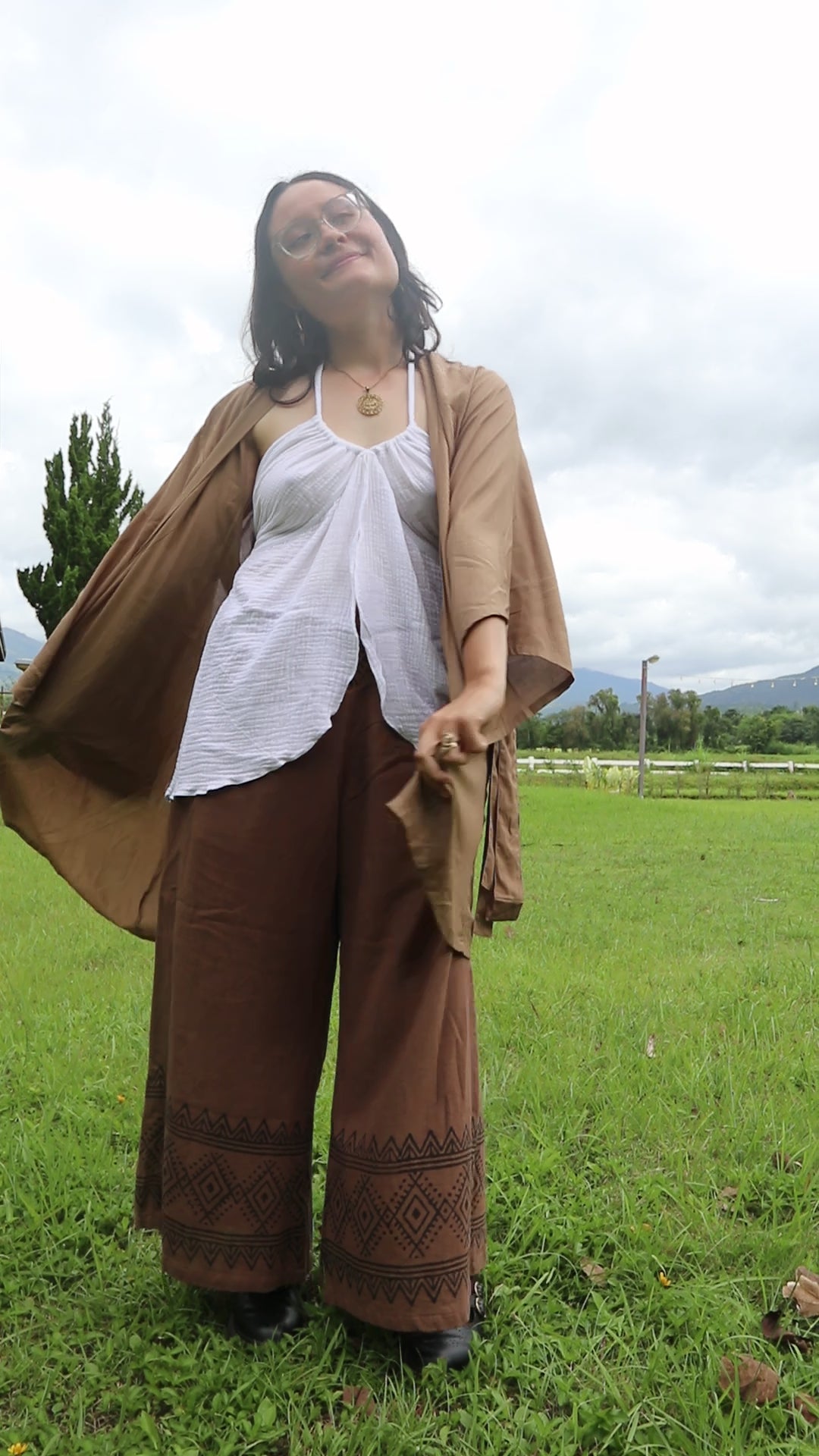 - 🌸 Wide-leg, flowy design with hand-printed sacred motifs