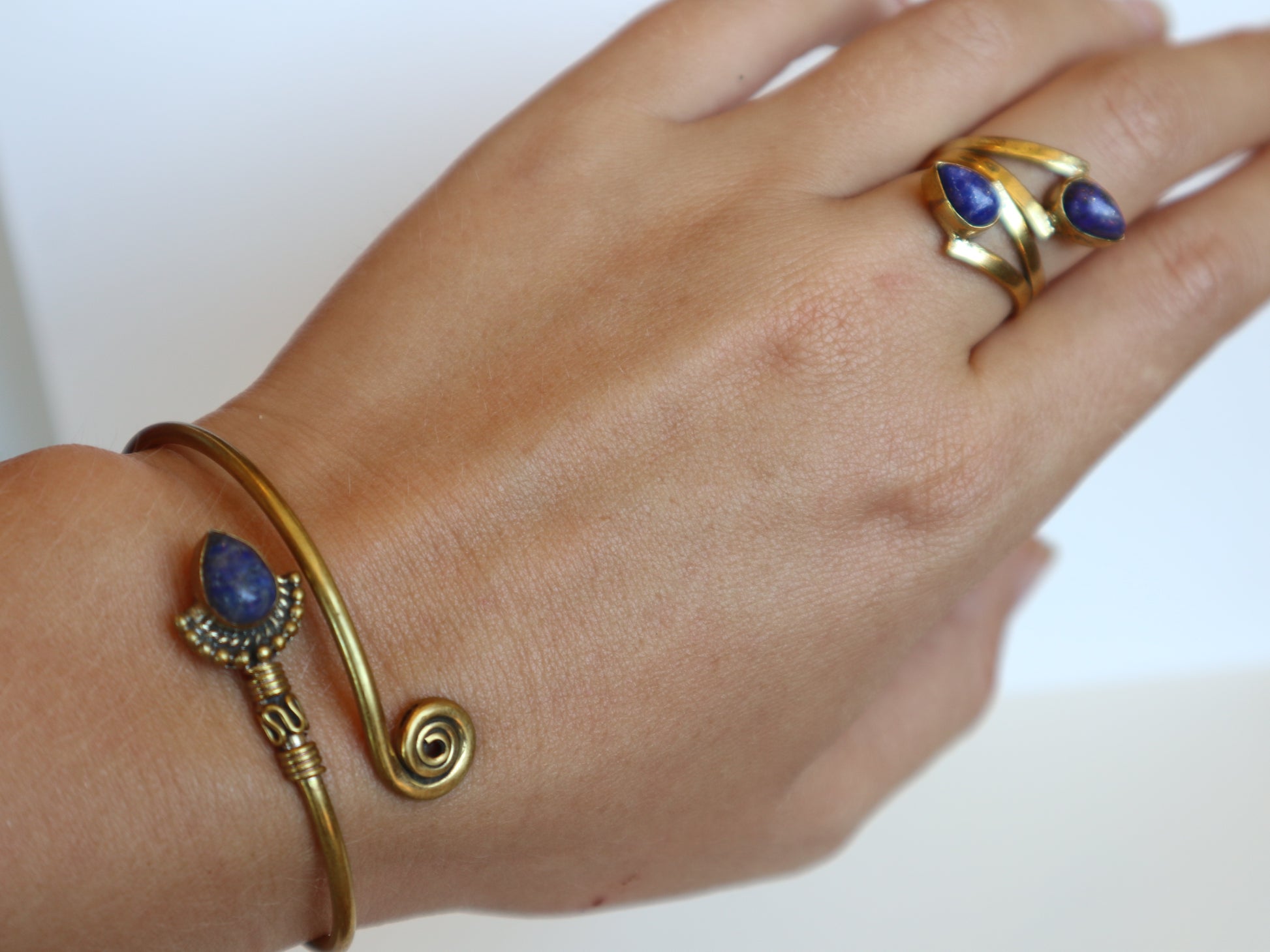 Beautiful handmade adjustable unisex brass bracelet and adjustable unisex brass ring with magical lapis lazuli