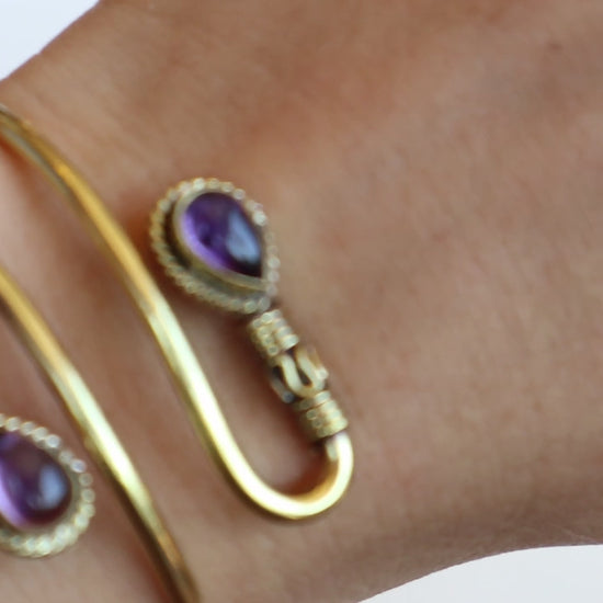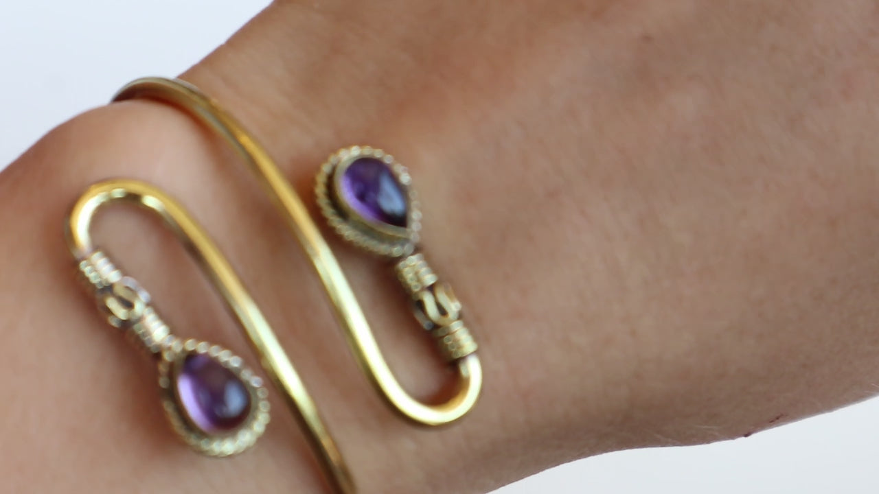 Beautiful handmade adjustable unisex brass bracelet with magical amethyst crystals